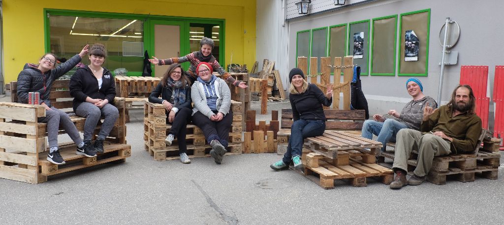 Am 7. und 8.4.2017 wurde bereits intensiv an der Einrichtung für die Dorfwerkstatt gearbeitet. Mit der Künstlerin Mizzi Pur und Mario Rampitsch wurde ein Palettenmöbel-Workshop veranstaltet. Die Einrichtung der Dorfwerkstatt soll vielfältig zusammengestellt werden. Wir würden uns über ein paar Möbelspenden, z.B. Sessel sehr freuen. Bitte nehmen Sie Kontakt mit uns auf: kontakt@werk49.at oder 03865-82022